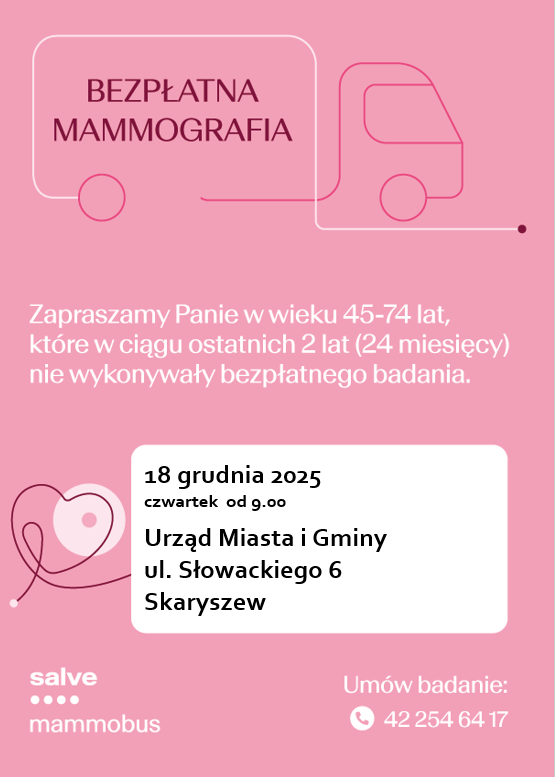 Zapraszamy wszystkie mieszkanki gminy Skaryszew w wieku 45-74 lat, które przez ostatnie 24 miesiące nie wykonywały mammografii na bezpłatne badanie mammograficzne finansowane przez Narodowy Fundusz Zdrowia.