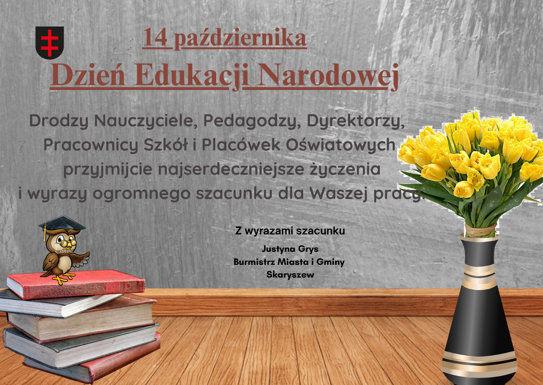 Z okazji Dnia Edukacji Narodowej pragniemy złożyć Państwu wyrazy najwyższego uznania i serdeczne podziękowania za codzienny trud, zaangażowanie i serce wkładane w wychowanie oraz kształcenie dzieci i młodzieży w naszej Gminie.