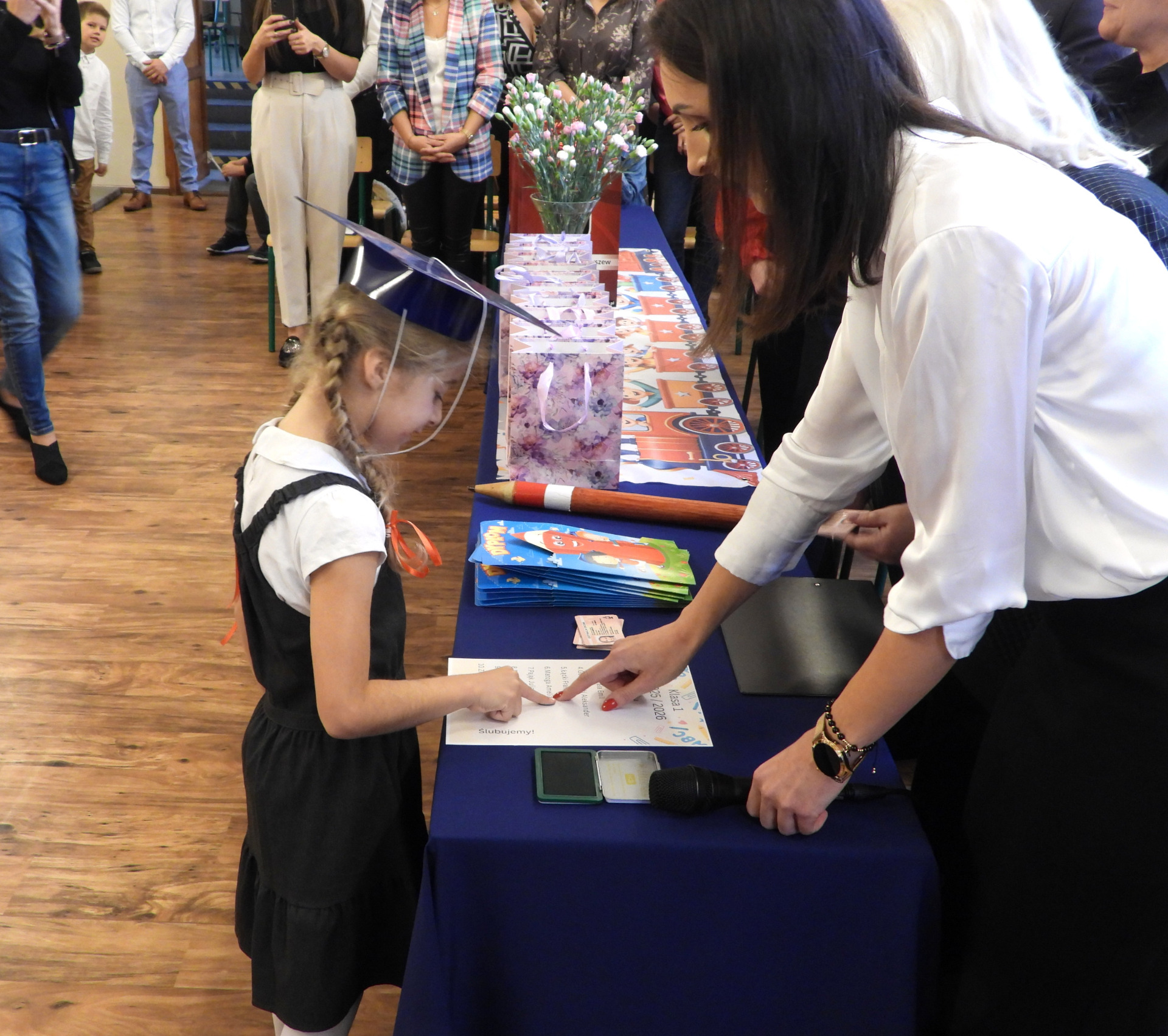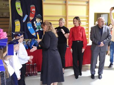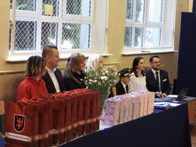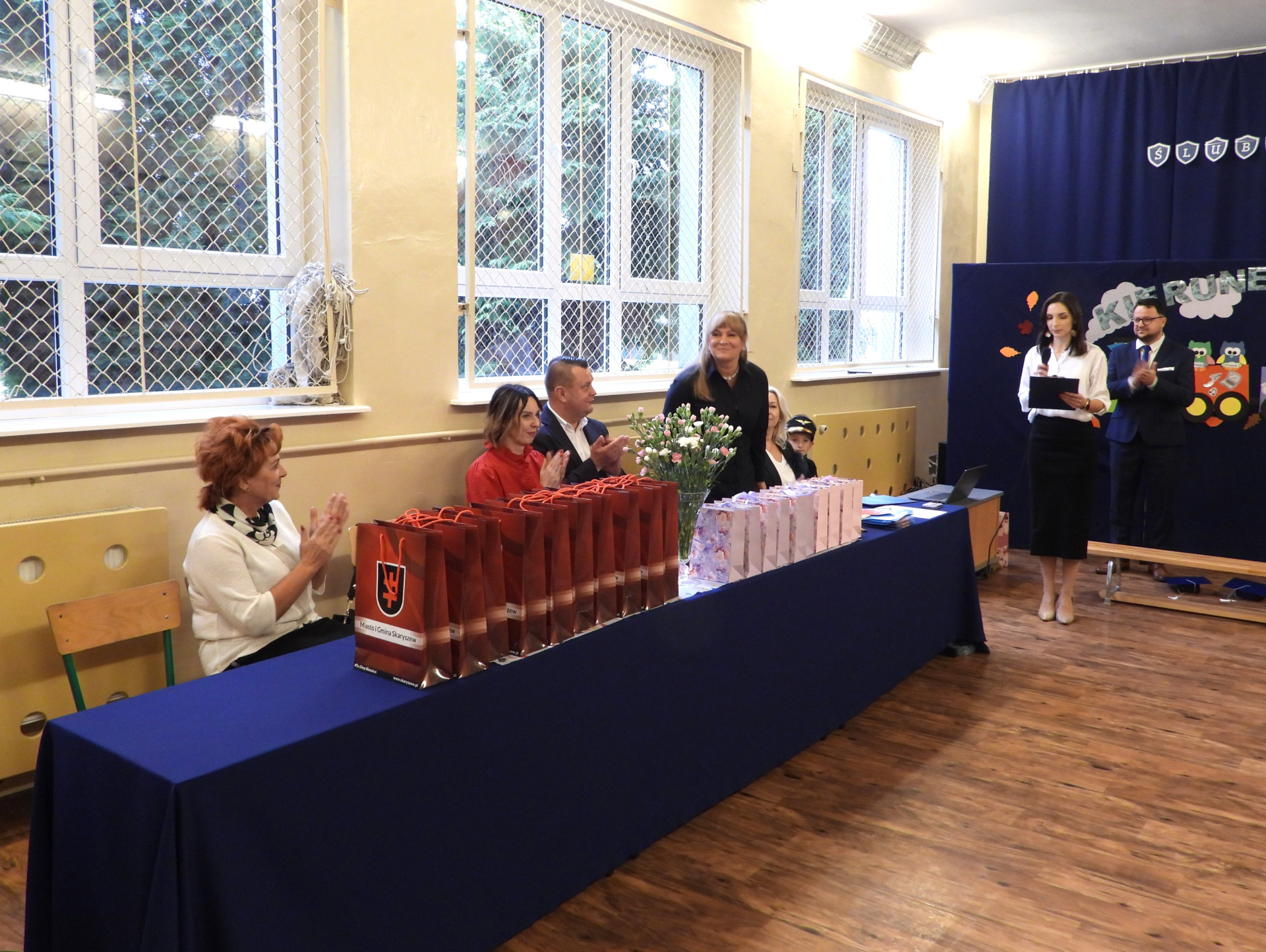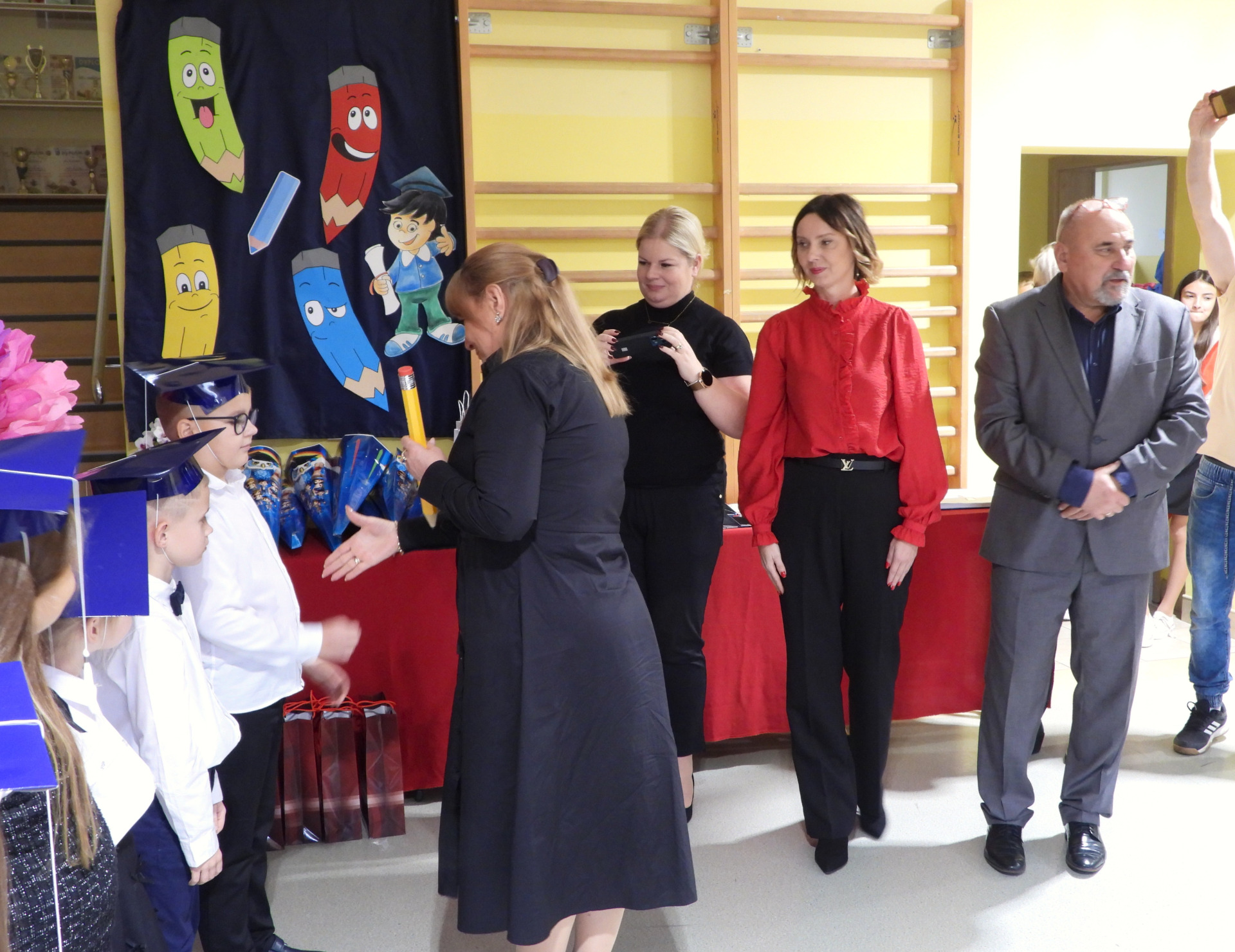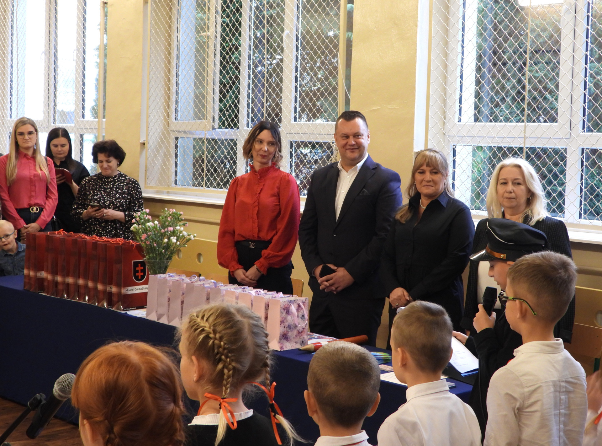 Pani Sekretarz Agnieszka Głowacka złożyła dzieciom serdeczne gratulacje oraz życzenia pomyślności na nowej edukacyjnej drodze. Podkreśliła, jak ważnym momentem jest pierwszy rok nauki, oraz wręczyła wszystkim pierwszoklasistom drobne upominki na pamiątkę tego wyjątkowego dnia.