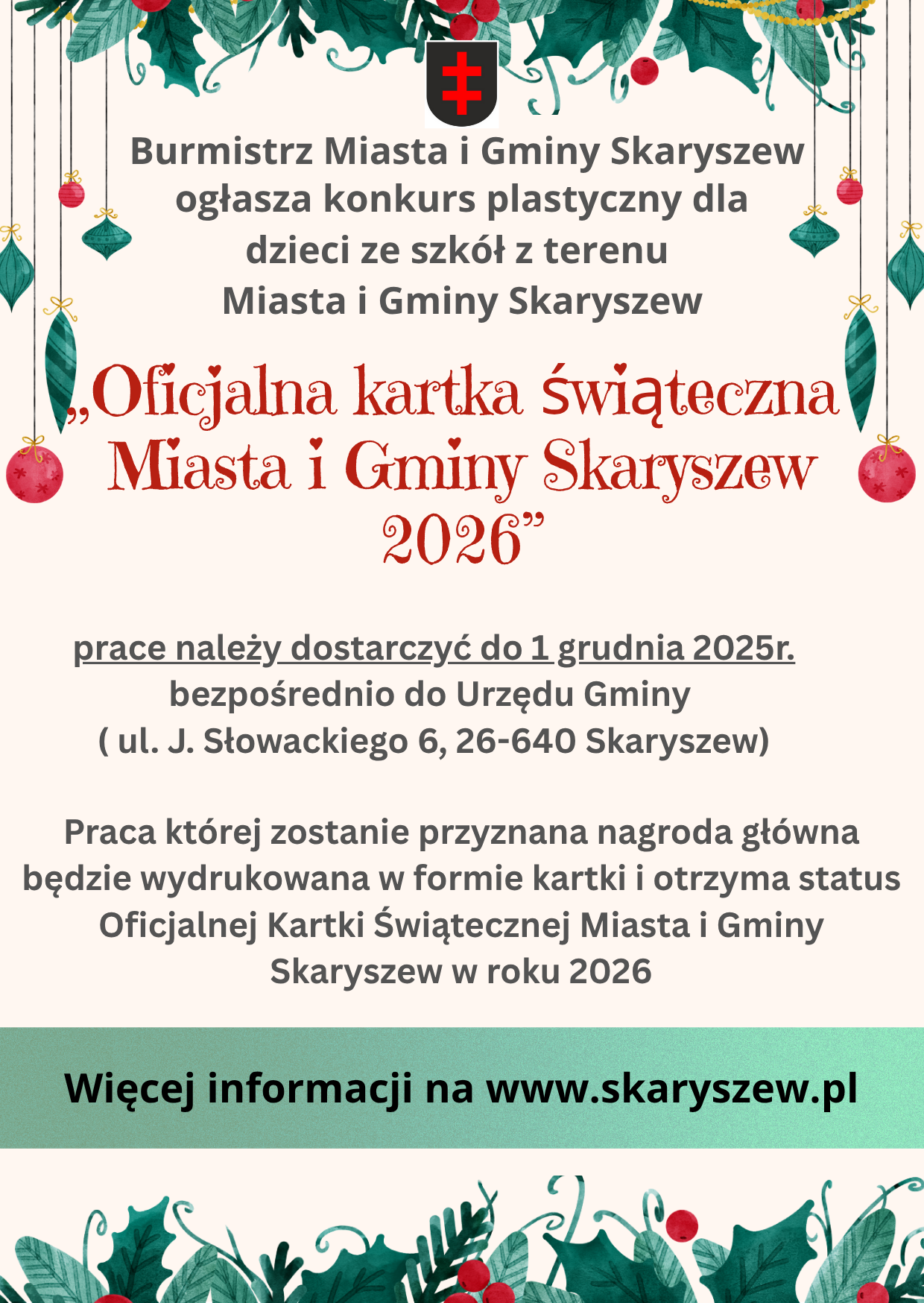 Burmistrz Miasta i Gminy Skaryszew zaprasza uczniów szkół podstawowych do udziału w konkursie plastycznym, pn.: „Oficjalna karta świąteczna Miasta i Gminy Skaryszew 2026”.