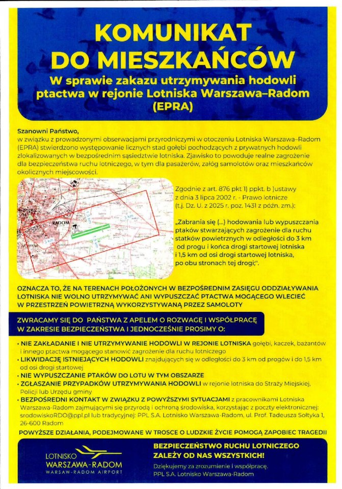 Zakaz utrzymywania hodowli ptactwa w rejonie lotniska Warszawa - Radom