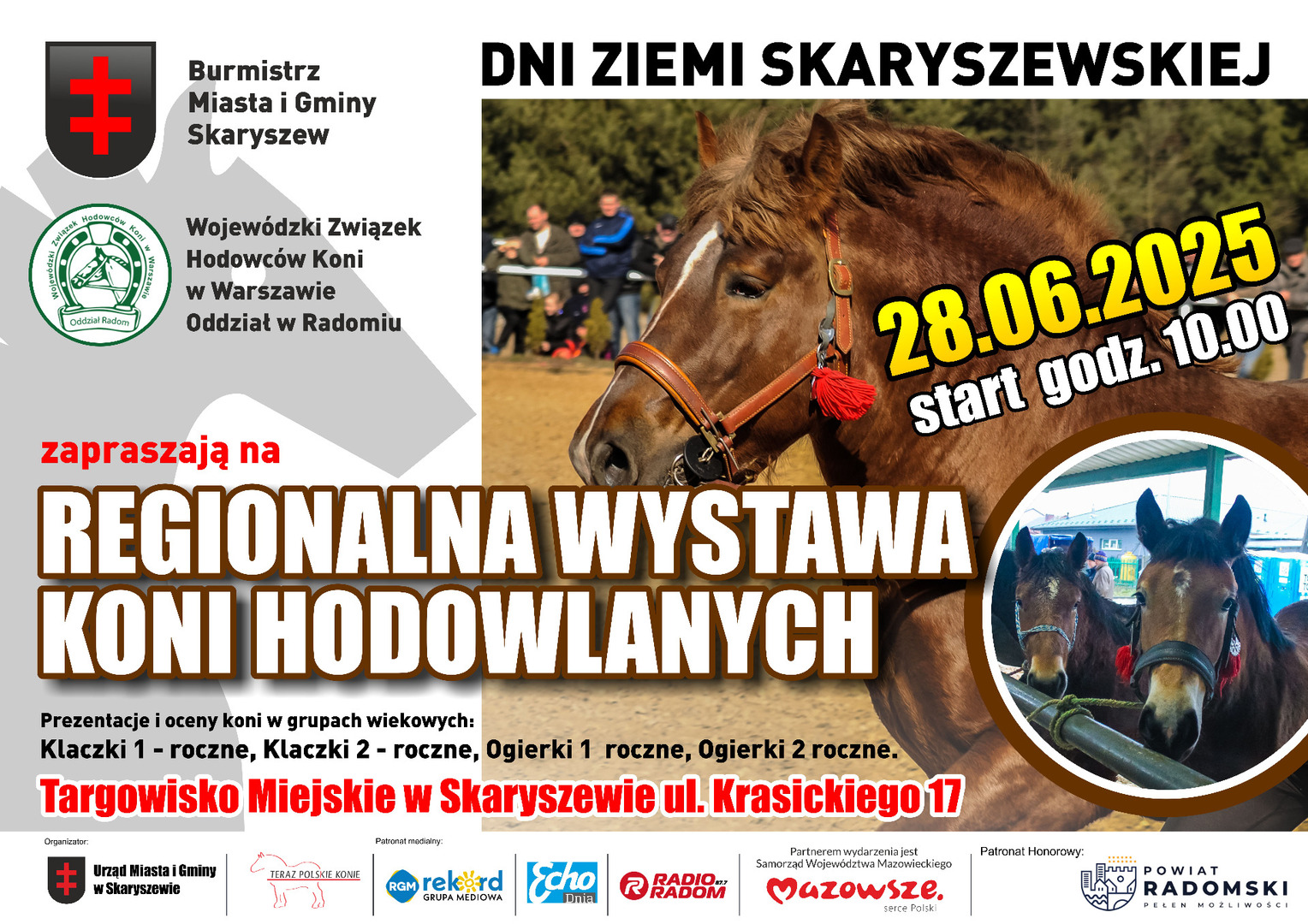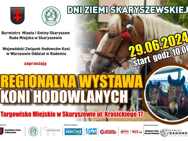 Po raz kolejny w ramach cyklu imprez z okazji Dni Ziemi Skaryszewskiej Miasto i Gmina Skaryszew wraz z Wojewódzkim Związkiem Hodowców Koni w Warszawie Oddział w Radomiu organizuje Regionalną Wystawę Koni Hodowlanych.